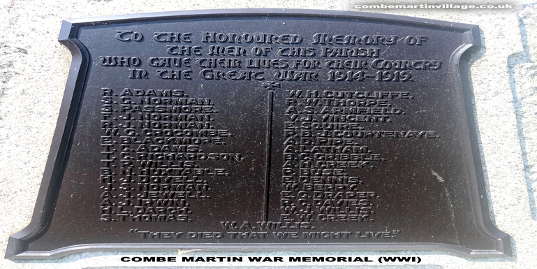 Combe Martin War Memorial was erected in 1921 and opened by the Bishop of Exeter. Made of light grey dressed granite with bronze relief plaques, the War Memorial honours the memory of the men of this parish who gave their lives for their country in the Great War 1914 -1919 (35 names). They died that we might live.